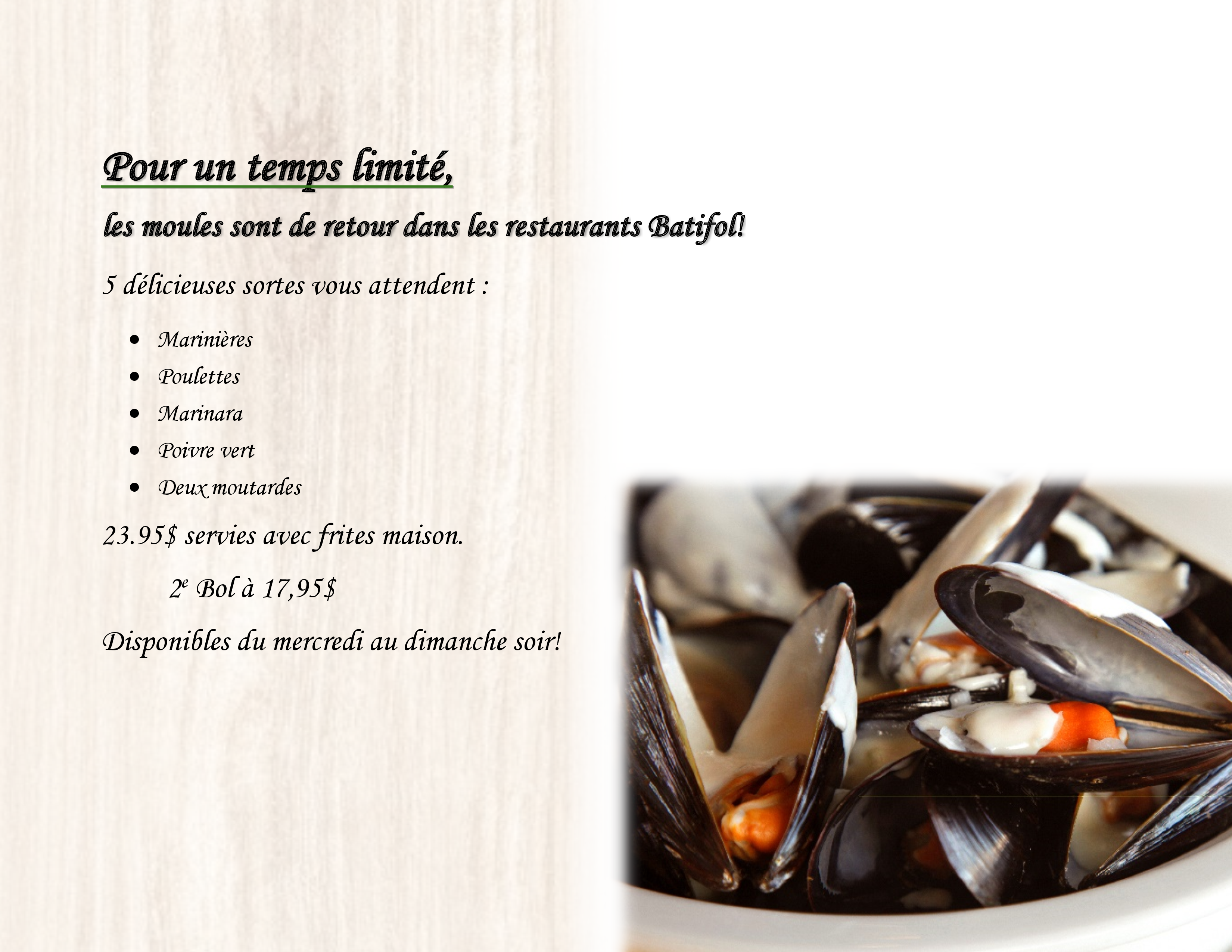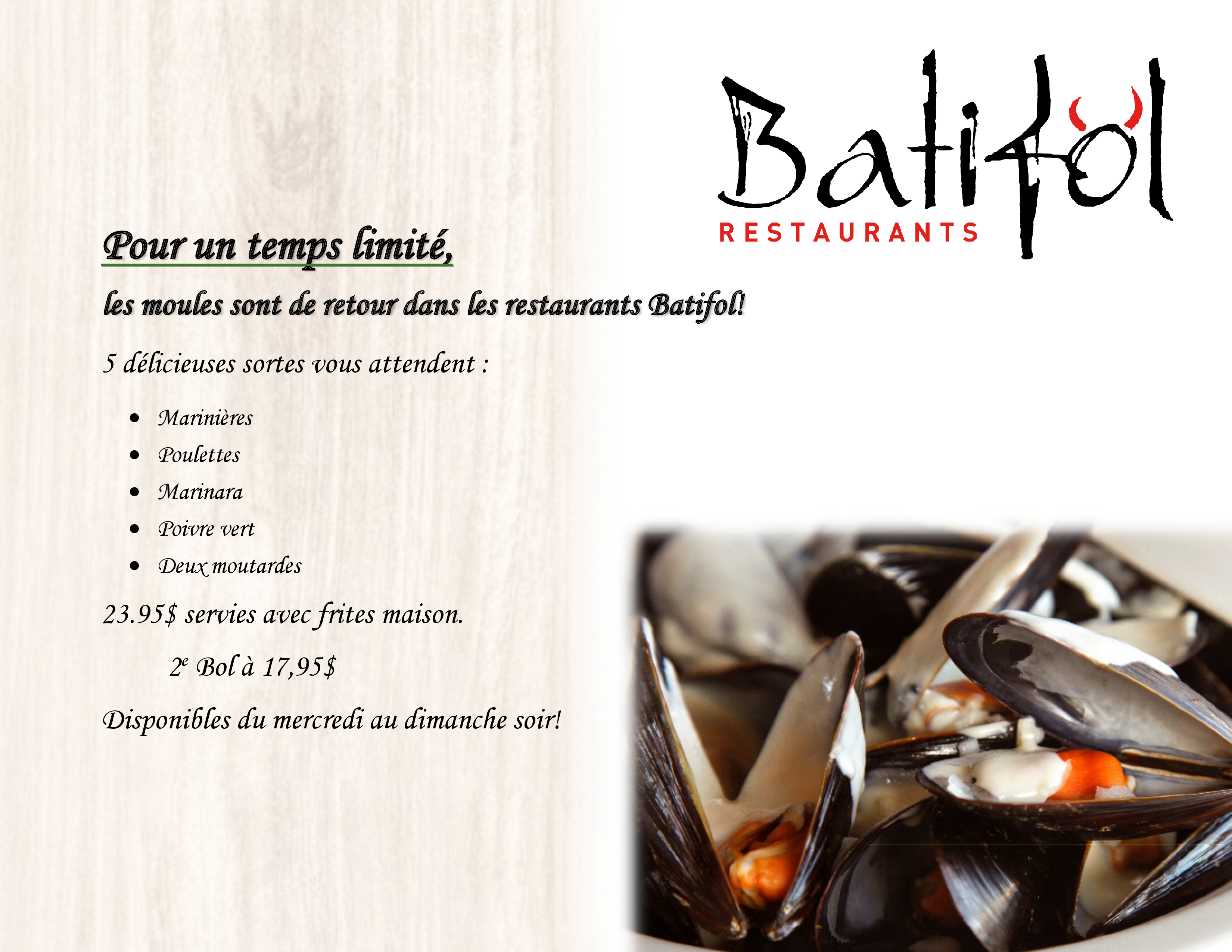Le BATIFOL s’impose comme incontournable depuis plus de 33 ans. Venez profiter de nos déjeuners, dîners et de nos soupers qui sauront vous ravir à coup sûr. Le BATIFOL on s’y retrouve avec plaisir.
